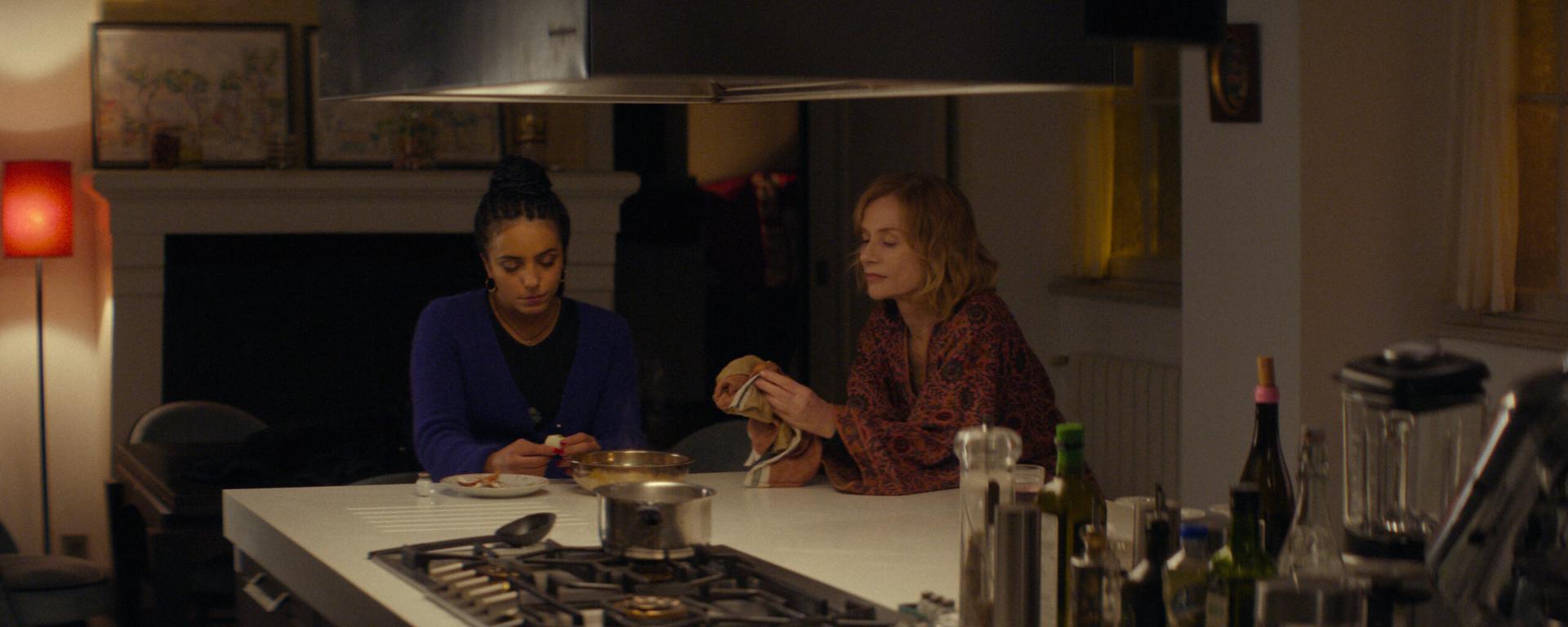 Le corps flottant d’Alma (Isabelle Huppert) se reflète dans les dalles noires qui ornent le plafond d’un fleuriste. Dédoublée et déformée, c’est par la rencontre avec cette femme sophistiquée mais fébrile que l’on entre dans le film. Difficile de choisir où regarder lorsque l’on épouse le point de vue de celle qui nous fait entrer dans son royaume. Une fois arrivée dans sa maison, Alma s’arrête devant un mur rouge, un clou est percé dans le vide. On comprend qu’un tableau a disparu. Une pizza à moitié dévorée et des légumes coupés sont abandonnés sur un plan de travail. Le temps est suspendu et Alma semble arriver après le spectacle, derrière le rideau qui ici est un mur auquel on se heurte. La Prisonnière de Bordeaux est un théâtre et ses comédiennes entrent en scène avec un temps de retard.