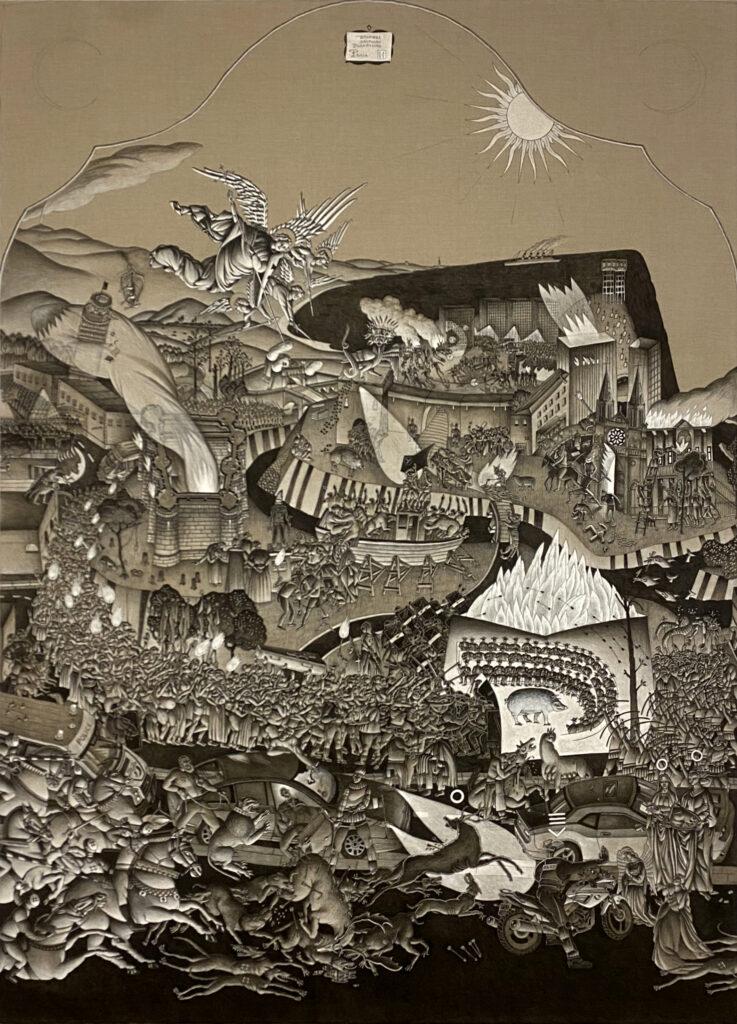 Les églises en feu, les villes dévastées, et le bestiaire hiératique du peintre sont à retrouver jusqu’au 1er mars à la Galerie de Valérie Delaunay à Paris dans le cadre de son exposition personnelle « Bagarre Dauphins et purgatoire », du nom de sa pièce maîtresse. Une immense toile de près de trois mètres de haut à la composition grouillante, et aux lignes de fuites chaotiques, avec au centre un cortège d’au moins 200 femmes manifestant aux flambeaux et en lutte contre des CRS, au premier plan une cavalcade moyenâgeuse avec chiens et loups lancés à la poursuite de pauvres cerfs, un fourgon de police, un embouteillage de voitures, des anges qui prient à genou, le procès d’un cochon.