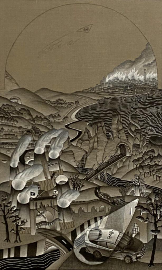 Parfois, il prend à Thibaut Huchard comme un sentiment d’étrangeté. Comme le 7 janvier dernier quand, ouvrant sa télé, le trentenaire découvre les images cataclysmiques des incendies dévorant Hollywood et Los Angeles. Le jeune artiste vient justement de finir « Fiat Lux », une toile sombre d’1m50 sur 90 cm aux perspectives sinueuses et inquiétantes sur laquelle se trouvent une centrale nucléaire à sept cheminées et, à l’horizon, une Amérique qui prend feu. Même bizarrerie qu’en 2019, le 15 avril avec le feu de Notre-Dame. Le peintre venait alors de mettre les dernières retouches à une toile illustrant une église ravagée par les flammes. « Certes, je n’avais pas peint Notre-Dame, mais ça m’a fait tout drôle, je dois dire ».