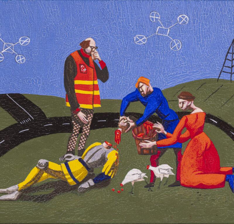 « Thibaut a sa façon bien à lui de parler des thématiques sociétales, avec un sourire narquois. », analyse Valérie Delaunay. Exemple avec « La roue–tourne », autre petit format où un bonhomme en chasuble de la CGT regarde deux témoins récupérer la tête d’un chevalier jaune gisant sur un rond-point. Clin d’oeil évident au mouvement social des gilets jaunes et à un démembrement opéré par la répression policière.