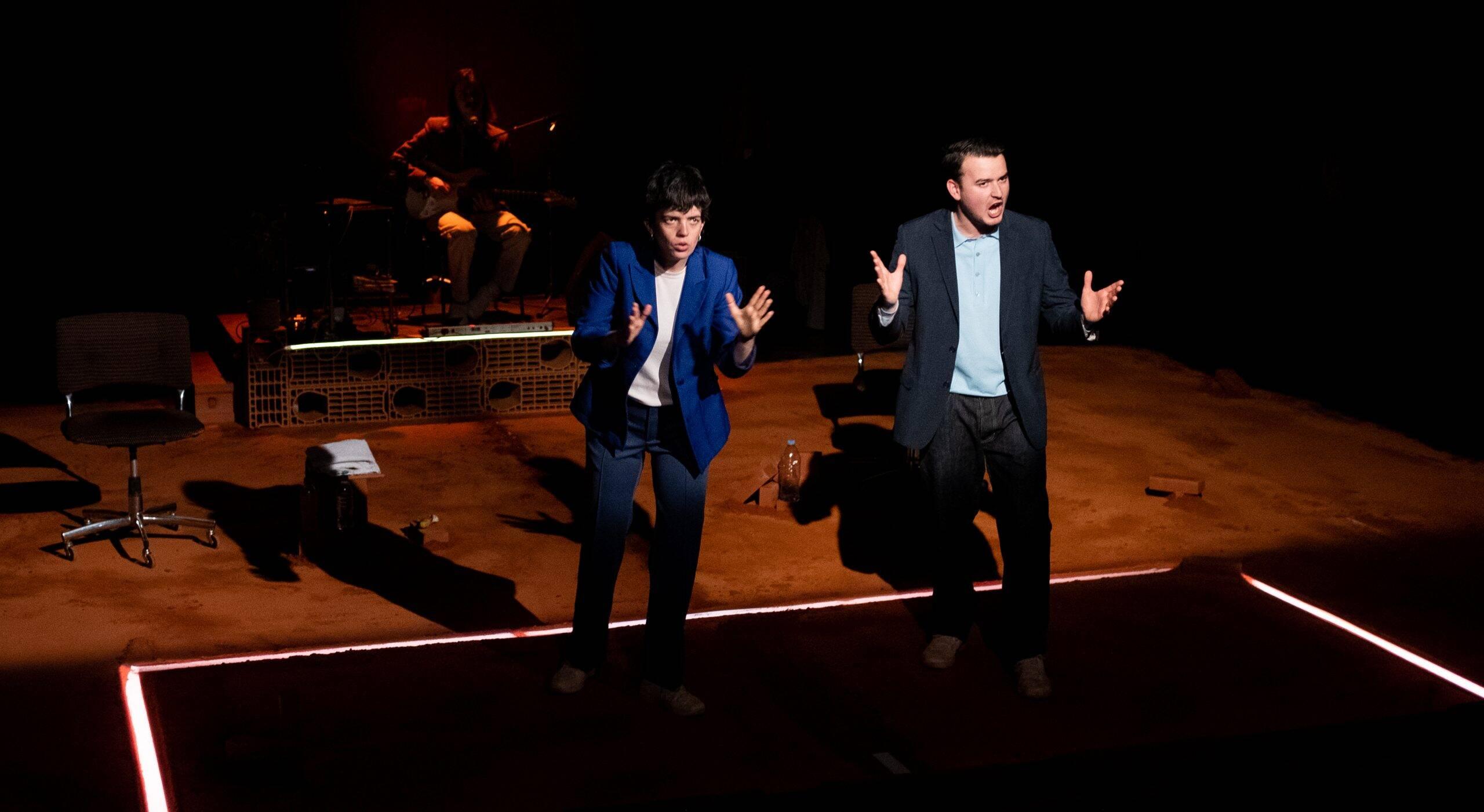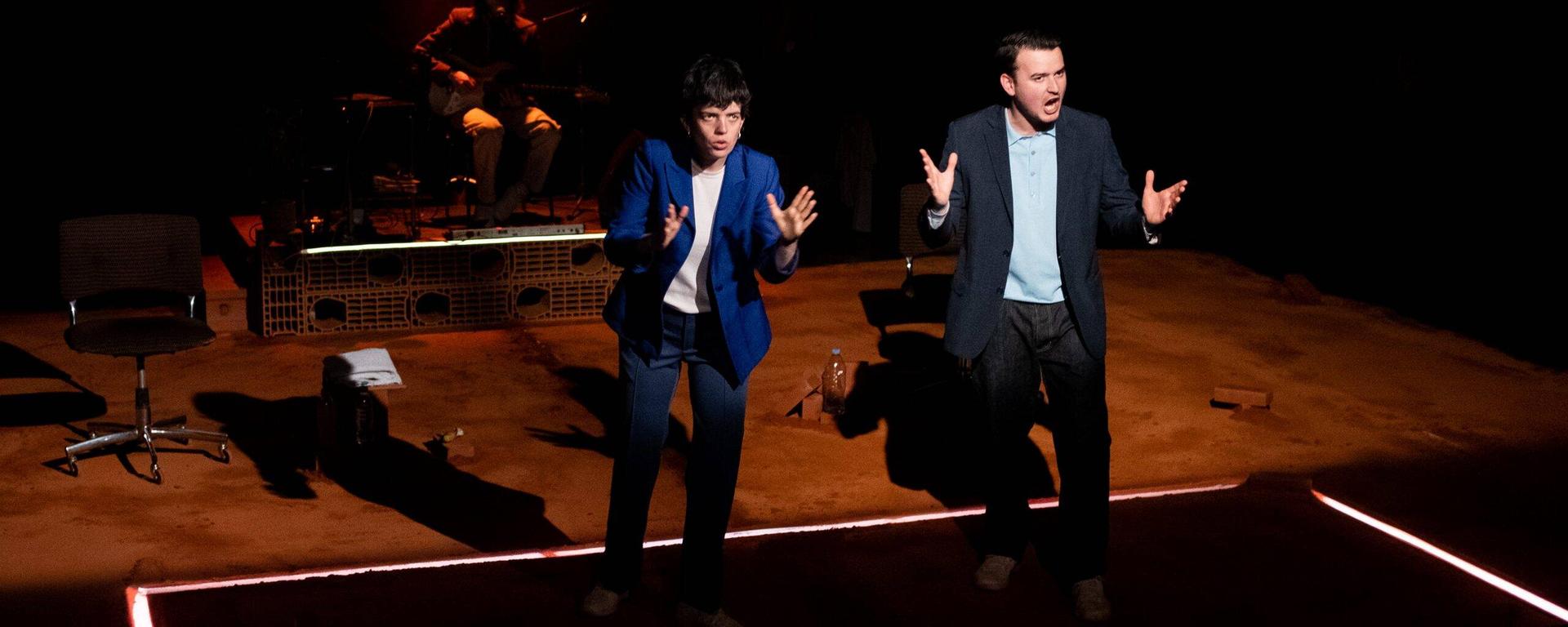 Si en public les deux commentateur.ice.s sont des partenaires, qu’en est-il des coulisses ? La longue relation des deux protagonistes se tisse sous nos yeux, plus complexe qu’il n’y paraît : on y entend la sexualisation -toujours violente- d’Ellen, mais aussi des malentendus, des blessures et des ambitions. La force du double discours -sportif et professionnel- attise les tensions entre les deux personnages avec humour et subtilité. Nous nous laissons mener par ce récit qui passe avec aisance de l’affrontement à l’émotion, du drôle au révoltant. Ce spectacle repose sur l’écriture claire et profonde de ces trois rôles portés par deux acteurs et une actrice étonant.e.s de justesse et d’énergie. Trois rôles et demi en fait : il y a celui d’Ellen (interprétée par Mathilde Wind) la journaliste qui revient après un congé maternité, Nathan (interprété par Alexandre Locatelli) le journaliste ancien collègue et camarade d’Ellen qui a repris ses antennes, et puis l’arbitre-patron (interprété par Arthur Chrisp). Ce dernier représente cette position délicate de la neutralité qui parfois se meut en lâcheté à force de ne pas départager le vrai du faux, le point de la faute. Car il y a aussi la question de la faute qui s’entend ici, celle depuis toujours imputée à la femme. Elle paie sa condition, elle doit s’excuser d’avoir pris ce congé, d’avoir éveillé chez le collègue des sentiments ambigus, d’avoir été plus professionnelle que son partenaire, elle est responsable et donc coupable.