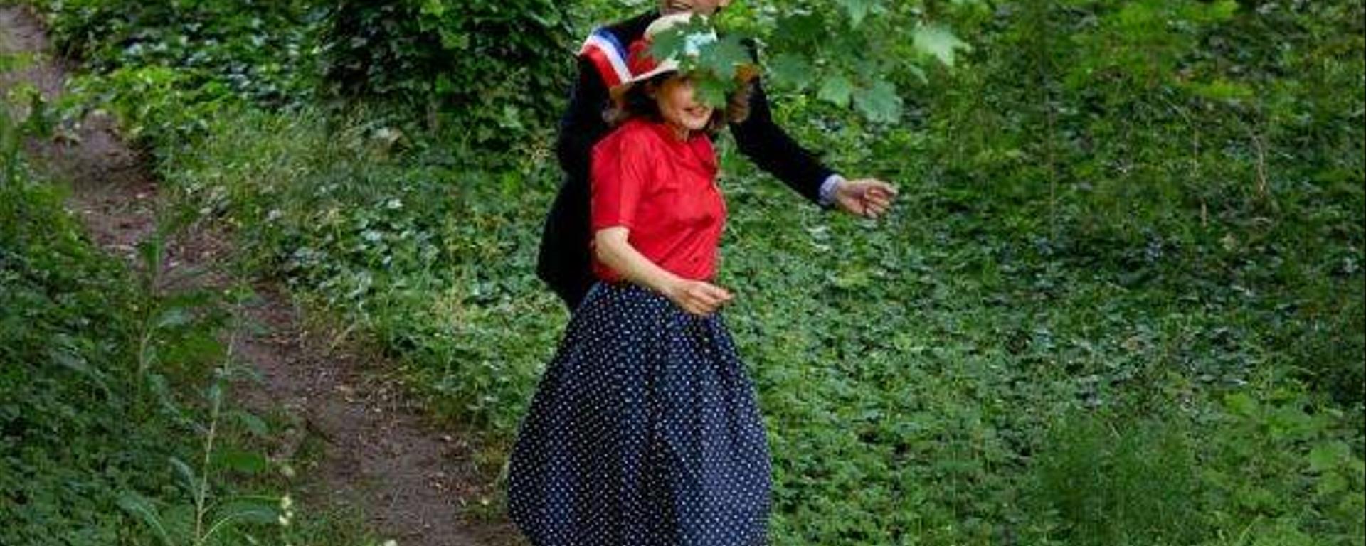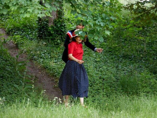 Et quand le décor n’est ni pensé ni construit par James Brandilly (assisté de Long Ha et Fanny Benguigui) et Pierre-Guilhem Coste, mais qu’il est pensé et construit par Dame Nature, le résultat est tout aussi saisissant. La troupe joue L’Arbre, le maire et la médiathèque dans le Parc Floral, à quelques pas de La Cartoucherie, avec tout ce qu’une représentation en extérieur peut avoir de dangereux mais aussi de merveilleux. Le spectacle commence normalement et on nous distribue des tracts en faveur de Julien Dechaumes, candidat aux élections cantonales de Vendée, avant de nous inviter à nous asseoir sur des ballots de foin à l’ombre d’arbres majestueux. Le slogan de la tête de liste socialiste « L’Avenir ensemble » n’a pas payé, et le maire malheureux de Saint-Juire apprend sa défaite en direct, face public. Résonne alors le tonitruant vacarme d’un meeting politique organisé par la majorité présidentielle (LREM, au moment où nous écrivons cet article) en vue des prochaines élections départementales, à deux pas de notre lieu de spectacle. Et les organisateurs du rassemblement d’annoncer comme des rock stars les membres du gouvernement : Marlène Schiappa, Jean-Michel Blanquer et consorts. Salves d’applaudissements, musique boum-boum qui fait vibrer le sol. Et nos acteur.rice.s de théâtre de jouer avec ce que leur propose la réalité et d’instaurer un dialogue entre la pièce et le meeting. Ils et elles rendent alors le propos on ne peut plus actuel ; Rohmer n’est pas moderne, il est atemporel.