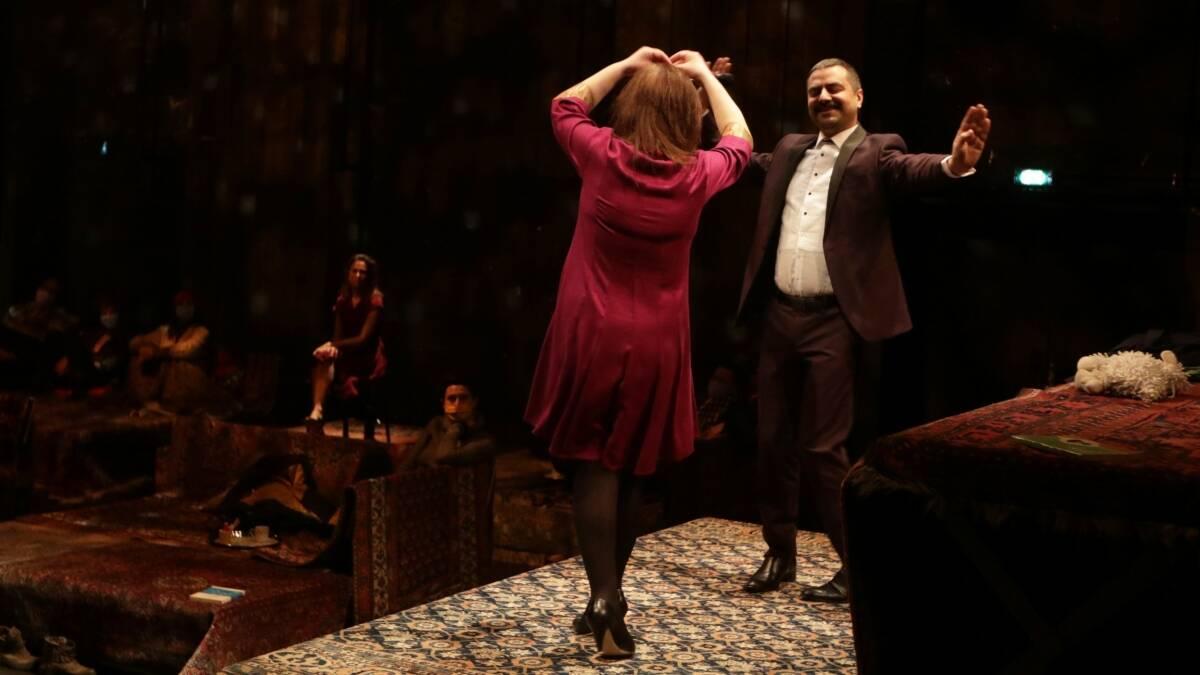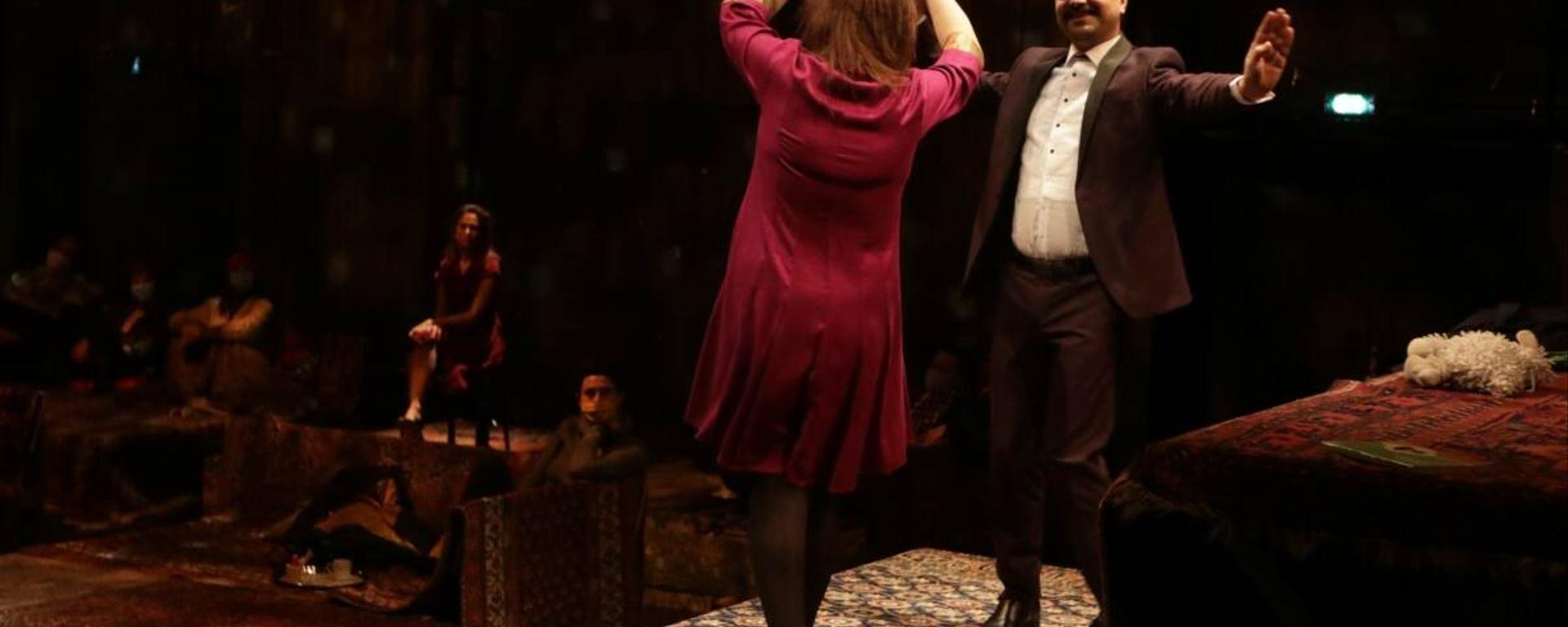 En entrant dans la salle, on hésite à s’installer sur les traditionnels gradins ou bien à se vautrer sur les nombreux tapis persans qui envahissent le plateau. Contre tout attente, Les Forteresses fait tomber le quatrième mur. Dès le départ, le ton est donné, nous devons nous installer confortablement pour ce voyage immobile de près de trois heures. La scénographie nous absorbe et nous installe in medias res au cœur du jeu. S’il peut y avoir une vague gêne de se sentir observé.es, les comédien.nes s’appliquent à prendre soin de nous. Iels déambulent sur scène et nous proposent boissons et collations. Nous sommes reçu.es comme des proches, comme des invité.es.