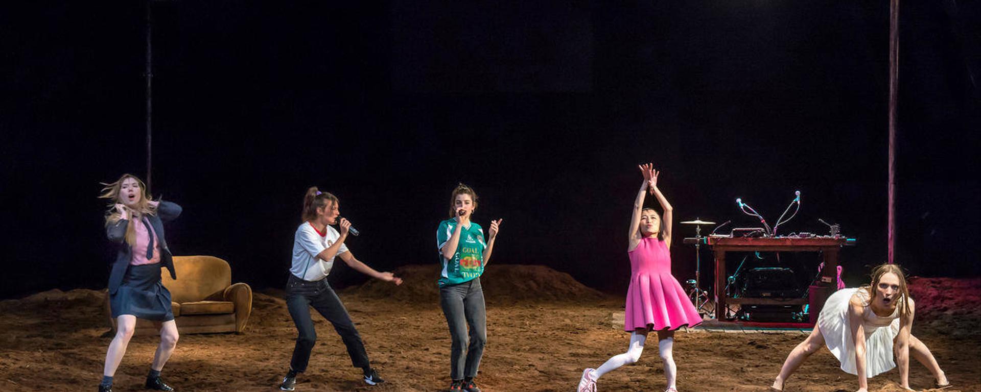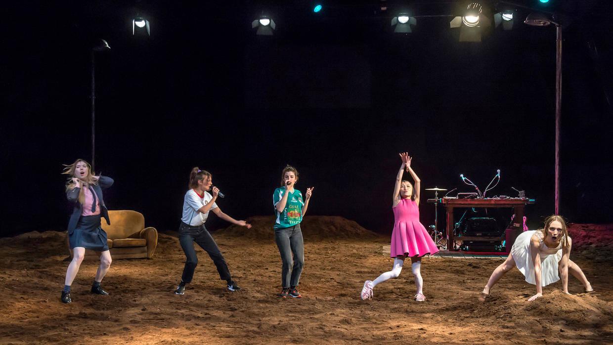 Armel Roussel nous emporte dans un rythme endiablé comme s’il voulait traduire l’intensité du drame qui se joue et le tourbillon dans lequel sont pris ces jeunes gens. La pièce est une pulsion frénétique, menée par des acteurs absolument remarquables. On se croirait dans un conte d’Hoffmann. La scénographie dessine des arrière-mondes où se joue un bal des fous. Les personnages sont possédés, mus par leurs passions, profuses, intenses et chaotiques. Alors les corps nus s’enlacent, se caressent, se tordent dans la terre qui recouvre le plateau. Tu es poussière et tu retourneras à la poussière. Les corps crient, les voix elles aussi se tordent pour se faire entendre et se confronter. Les enfants hurlent sur les parents, les parents hurlent sur les enfants. Les enfants hurlent sur les professeurs, les professeurs hurlent sur les enfants. Le chaos sonore et corporel est porté par le groupe de hip-hop / RnB Juicy de Julie Rens et Sasha Vovk. La performance live, soutenue par un jeu de lumière absolument remarquable, donne corps au drame, à la « tragédie enfantine » considérée comme une « insensée cochonnerie » par l’Allemagne de Bismarck.