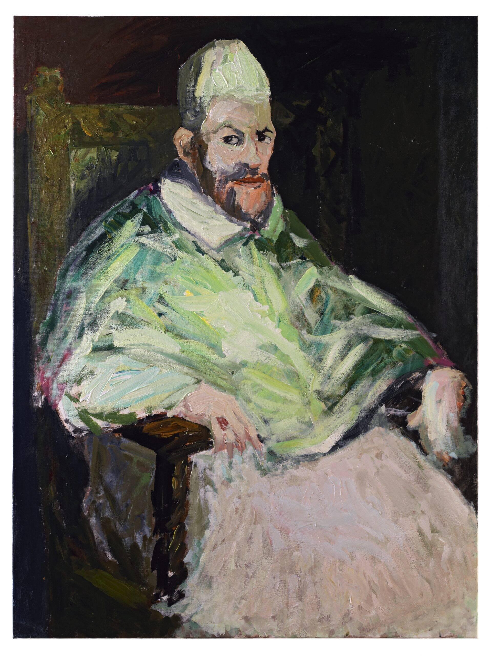 Une dernière salle est consacrée au chantier Velasquez. Pendant un an et demi, Giorda a peint à sa façon les tableaux de Velasquez, le peintre reçu en héritage. Les toiles de Velasquez toutes barbouillées de matière écrasée, aplatie, se mettent à crier pour rejoindre avec force l’œuvre de Patrice Giorda. Ce n’est pas tant pour lui rendre hommage que Giorda a mené ce chantier, même s’il aime puiser dans l’histoire de la peinture, mais parce qu’il avait besoin de ces drôles de personnages choisis par Velasquez, les nains, l’infante. Une correspondance s’établit avec les portraits égrenés précédemment. « Qui sommes-nous face à l’autre ? » Et bien Giorda est systématiquement un peintre face à l’autre. Et il nous a offert partout dans le Fort de Vaise des gueules, pas cassées, mais déformées parce qu’épousées par la toile, des gueules pleines qui remplissent le Fort de Vaise de leur présence.