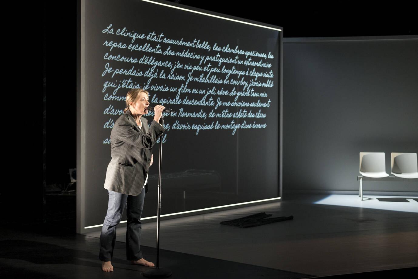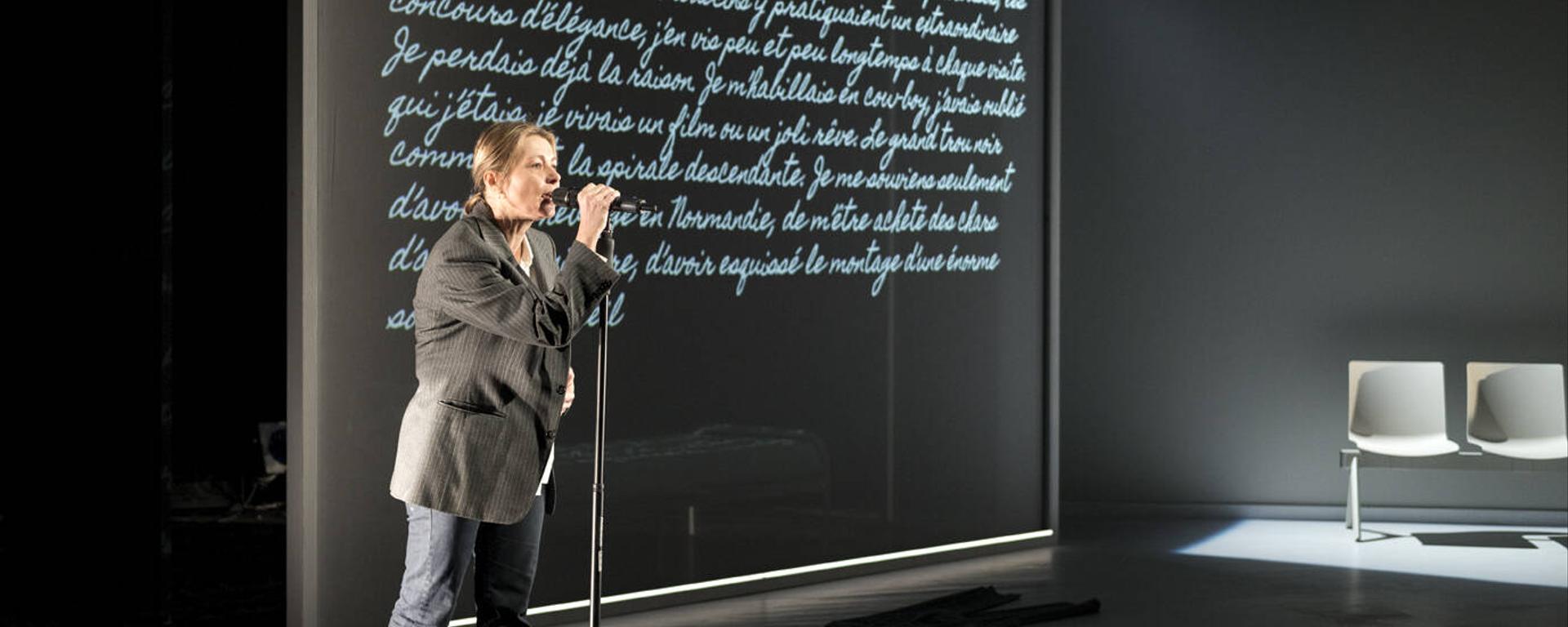 Elisabeth Chailloux reprend la structure du roman original, tout en en supprimant des parties et en livrant un spectacle rythmé, donnant littéralement une place aux mots des différentes entrées de l’abécédaire qui se succèdent et sont projetés, en blanc et sur les toiles dressées devenues noires, comme le négatif d’une photographie, comme l’envers du décor et comme l’autre face de la médaille, celle de l’impossible identité immuable et figée. Jouant sur les typographies autant que sur les voix, le texte du père et l’expression de sa noirceur résonnent dans ce micro dans lequel Sarah Karbasnikoff murmure un râle mélancolique et statique, qui donne à voir la part d’ombre de l’homme, celle que nous avons tous en nous mais que le trouble bipolaire de ce père exacerbe.