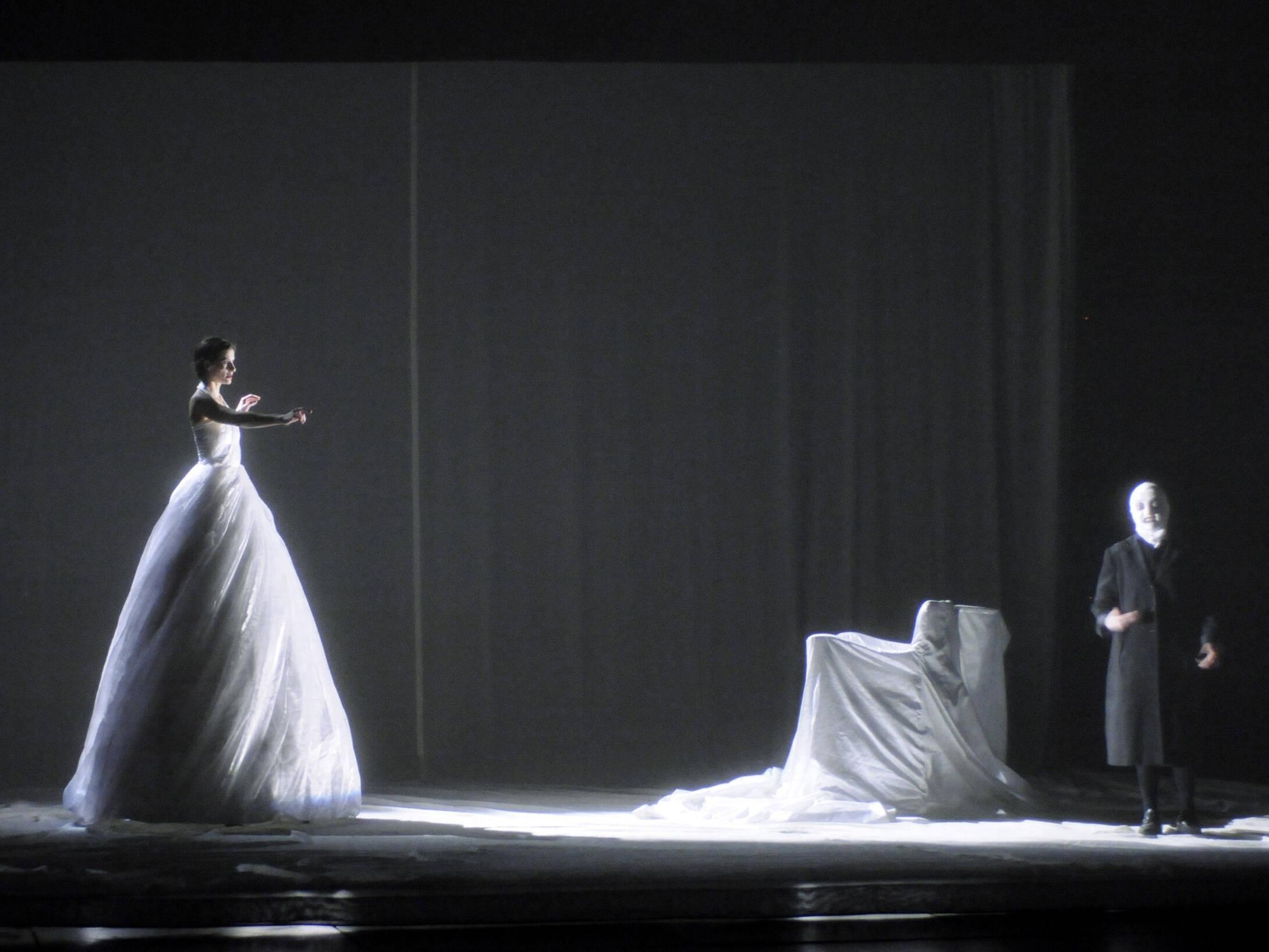 Le spectateur est à la fois un peu désorienté par la succession rapide de ces effets d’illusion, et émerveillé au premier degré par les lumières et les couleurs, la virtuosité des enchaînements d’univers. Et il est vrai que certaines trouvailles sont efficaces : j’ai été moi aussi saisie comme une petite fille. L’exemple le plus frappant en est l’arrivée au pays des enfants, simplement matérialisé par un de ces fameux rideaux blancs derrière lequel scintillent les lumières tournoyantes d’un parc d’attractions, accompagnées des cris hystériques des petits passagers dans les wagons des montagnes russes – un bruit à la fois attirant et effrayant, tant leur surexcitation semble déplacée derrière ce rideau mystérieux, tout autant que l’inquiétante figure d’initiateur qui leur ouvre la porte du domaine… Si certains effets comme celui-ci – parmi d’autres – sont si réussis dans leur puissance évocatrice, il m’a semblé cependant que le spectacle se reposait sur eux de manière trop systématique. Dans son tourbillon de lumières qui défilent, Pommerat en perd parfois la direction de son propos ; la succession intempestive des noirs agace un peu, et met en danger le rythme global déjà précaire à cause de la structure narrative en petites scénettes interrompues par le bonimenteur-conteur. Si visuellement le spectacle fascine par sa beauté plastique, il aurait à mon sens gagné par un peu plus de simplicité dans la technique.