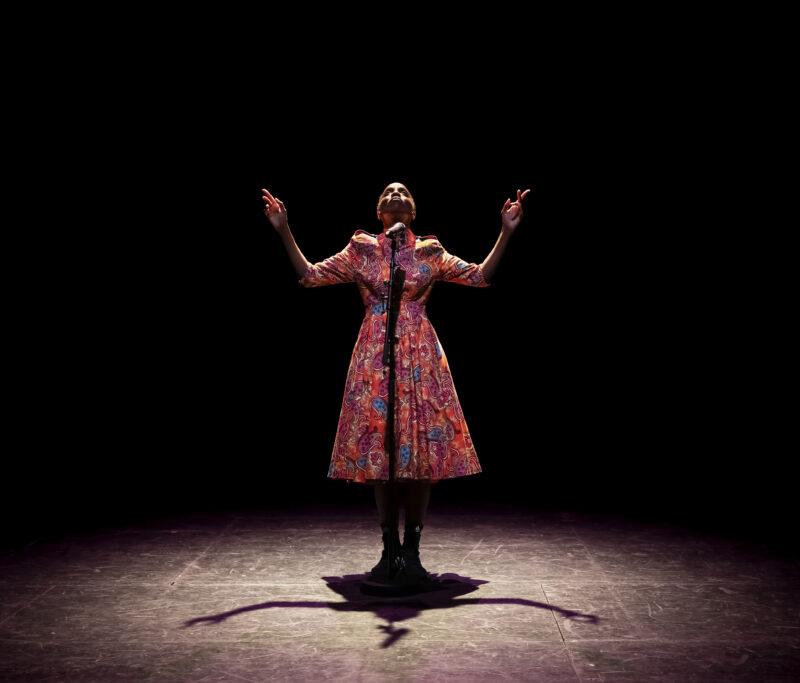 Le spectacle Portrait de Rita prend pour point de départ l’histoire de Mathis, un écolier de neuf ans, scolarisé près de Charleroi et victime de racisme. En réaction, il finit par se mettre en colère. Sa réaction est jugée incontrôlable par l’école qui décide d’appeler la police. Lorsque sa mère arrive sur place, après avoir été sommée par l’institutrice de venir, elle découvre son fils plaqué au sol par un agent de police qui l’étouffe avec violence, rappelant celle du policier américain qui s’acharnait en 2020 sur George Floyd jusqu’à le tuer. Cette histoire, Laurène Marx l’a découverte en 2023, lorsque la performeuse Bwanga Pilipili dit, à la Nuit de l’Amour aux Halles de Schaerbeek, un texte qui parle de violences policières et de cette agression subie par l’enfant noir de neuf ans. Comme c’est le cas depuis son entrée à la crèche belge, et même, depuis l’arrivée en Europe de sa mère, Rita Nkat Bayang, une femme d’affaires camerounaise qui a décidé de quitter Yaoundé, Mathis n’est jamais un enfant, mais toujours un Noir. Laurène Marx décide alors avec Bwanga Pilipili de rencontrer Rita Nkat Bayang qui leur livre le récit de sa vie, et avec elle, celles de Mathis et de toutes les personnes racisées. C’est la même Bwanga Pilipili, vêtue d’une robe fleurie et d’une paire de chaussures de boxe Adidas noires, qui leur prête sa voix, lorsqu’elle s’avance sur la scène du Théâtre Ouvert pour s’installer derrière un micro sur pied qui trône au milieu d’un plateau nu.