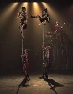 Le geste circassien intervient en dialogue avec cette scénographie très pensée, et invite à traverser ces questions d’amour et de désir en plongeant dans des images hautement symboliques. Les acrobates se réapproprient notamment la technique des portés à la perche, consistant pour un voltigeur à grimper en haut d’une perche non posée au sol mais tenue en équilibre par un porteur. Créant de la dépendance et une nécessaire écoute entre les deux acrobates, ces portés étayent avec physicalité, humour et poésie les représentations du couple interrogées par le spectacle.