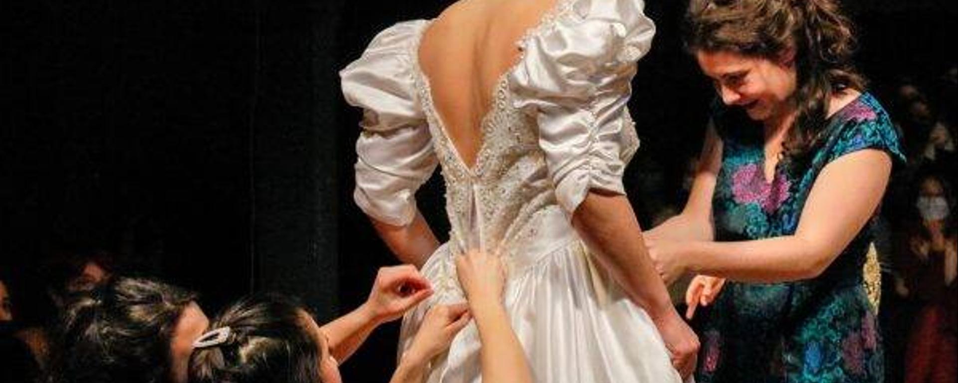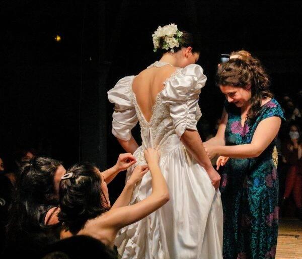 Dans la petite salle du Lavoir moderne parisien, nous faisons cercle autour de cinq jeunes femmes qui nous accueillent sans façons, en pyjama ou petite culotte, la brosse à dents à la bouche, assises derrière leur coiffeuse. C’est aux coulisses de leur transformation en beautés fatales pour le mariage de l’une d’elles que nous allons assister, une transformation qui tient autant de la mutilation que de la farce, comme les injonctions énoncées dans le poème « Recette de femme » de Vinicius de Moraes récité au début de la pièce.
