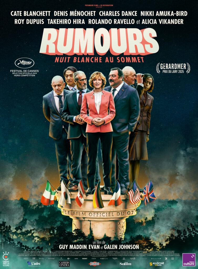 Le début de Rumours s’affiche donc comme une satire politique assez primaire, invitant le spectateur à jouer au jeu des sept différences entre les dirigeants réels, les dirigeants fictifs et les pays qu’ils représentent. Certaines ressemblances sont plus évidentes que d’autres, à l’image de Cate Blanchett grimée en Angela Merkel, accent, coupe et habits compris. Mais les personnages sont également habités par leurs contextes historiques et géopolitiques respectifs : le président français croit voir des manifestants partout, l’Américain rêve de mourir assassiné en fonction et le Premier ministre canadien baragouine dans un langage positivo-hypocrite sur les femmes et les minorités. Nous nous retrouvons vite à surinterpréter les relations et les réactions des personnages, ce que le film ne manque pas de tourner en dérision : l’Allemagne vient de courir après le Canada, trouvez la métaphore ! Mais, le temps de se livrer à notre jeu de piste géopolitique, la nuit est...