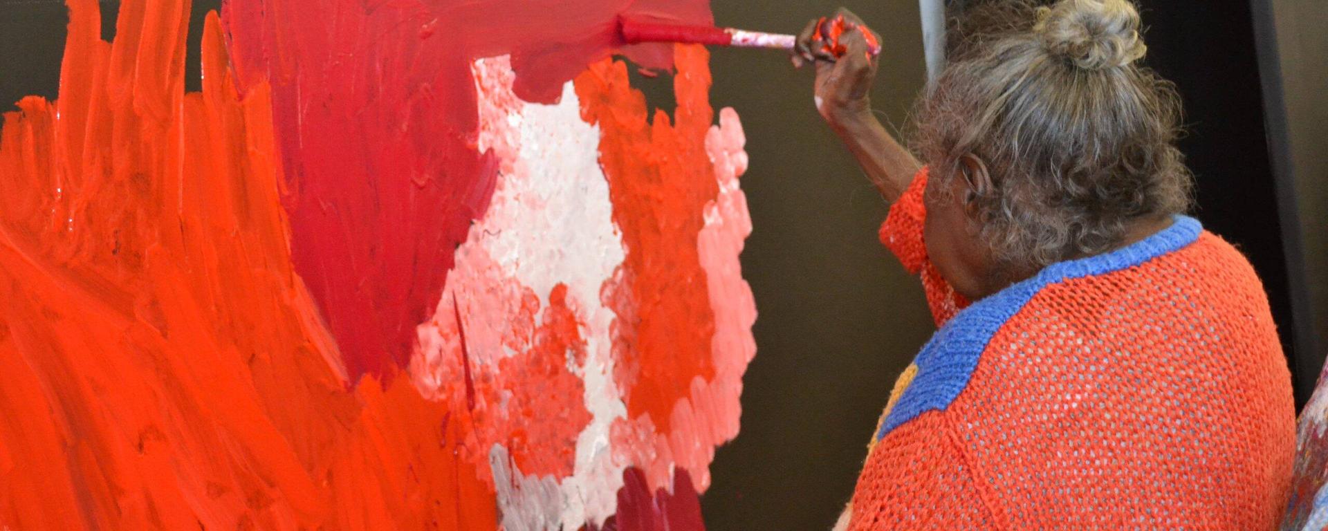 Décédée en 2015, Sally Gabori commence à peindre ses toiles colorées, à raison d’une à plusieurs toiles par jour, à 81 ans. Jusqu’à sa mort et en seulement 8 ans, l’artiste produit plus de 2000 tableaux. Son ascension est immédiate. Très vite, Sally Gabori s’impose comme figure de proue de l’art contemporain en Océanie. De son vivant, ses œuvres sont exposées à la Queensland Art Gallery et elle est invitée à la Biennale de Venise en 2013. À travers une trentaine d’œuvres, la Fondation Cartier revient sur quelques années intenses où Sally Gabori peint frénétiquement, imprégnée par la nostalgie de l’île qu’elle a été contrainte de quitter à 24 ans.