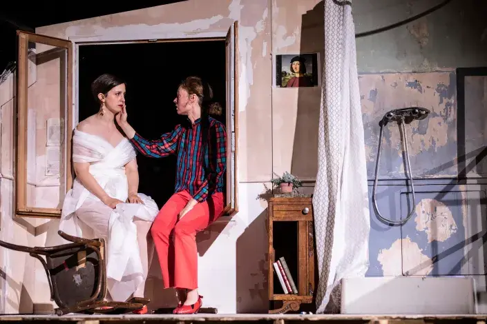 Sans attendre donc, il est question de morceaux, de résidus, de fragments et de fragmentaire, une notion chère au romantisme allemand mis à l’honneur dans le spectacle par Schumann et ses Lieder qui servent de squelette et de charpente à déconstruire et à réagencer dans les différents tableaux qui constituent la pièce. Comme le suppose même le titre du spectacle, Sans tambour, qui vient sciemment éluder la seconde partie de l’expression « Sans tambour ni trompette » qui désigne ce qui arrive sans se faire remarquer et dans le plus grand des secrets, la peine d’amour suppose le vide et l’absence soudains. La maison que toutes et tous au plateau participent à démolir jusqu’à venir en emporter les gravats dans les coulisses dit, concrètement et métaphoriquement, la sensation d’effondrement de celle ou de celui qui perd un amour. Cette maison est une clef de voûte du spectacle comme de l’imaginaire de Samuel Achache. Dès 2017, le collectif La vie brève, emmené par le duo qu’il compose avec Jeanne Candel, montait La Chute de la maison, un spectacle directement inspiré de la longue nouvelle d’Edgar Allan Poe, La Chute de la Maison Usher – là déjà un titre tronqué et lacunaire. Le collectif inaugurait alors ses variations sur le thème de la maison et de l’habiter, approfondi dans Sans Tambour où il s’agit de redonner à ces deux verbes, « habiter » et « résider », toute leur puissance sémantique : celle de ce qui demeure, faisant de la maison et de l’habiter, comme chez Heidegger, cet espace qu’on investit pour y rester, ce lieu qu’on acquiert et qu’on conquiert pour soi et pour tous ceux qui fondent alors ce qu’on avait pour habitude autrefois d’appeler la maisonnée (comme dans la « Maison Usher » de la nouvelle de Poe d’ailleurs).
