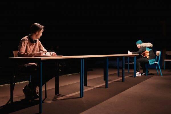 Le texte de Marilyn Mattei s’inspire d’une série d’agressions sexuelles entre adolescents, un fait divers rapporté à l’autrice lors d’une résidence d’écriture dans un collège. Ce « jeu » ne semblait pas poser problème aux jeunes garçons, qui n’avaient pas conscience de la violence de leurs actes. Car dans les années collège et lycée, longues transitions vers l’âge adulte, ce qui importe avant tout c’est le fait de « vivre un jour comme un lion, plutôt que cent jours comme une chèvre ». C’est le regard des autres et l’endroit où l’on se situe, socialement d’une part mais aussi physiquement (dans quel lit du dortoir, à quelle table de la cantine ou dans quel espace de la cour du collège a-t-on le « droit » de s’installer ?). Le personnage de Noa est imbibé de cette angoisse et de cette urgence, et se laisse traverser par les rites de passage imposés. Dans Seuil, Marilyn Mattei utilise une langue étrange et pourtant familière, où les « je » et les « tu » disparaissent souvent : les phrases sont nettes, acérées et affirmatives, et invoquent une certaine universalité. Les deux comédien·nes, Baptiste Dupuy et Camille Soulerin, interprètent avec force ces dialogues coups de poing, où l’on s’invective et se coupe la parole pour toujours s’assurer que l’on domine.