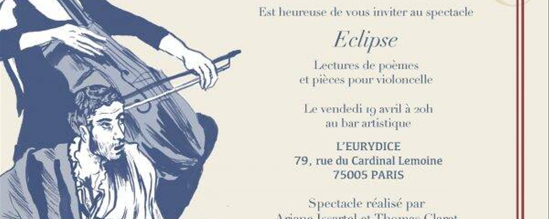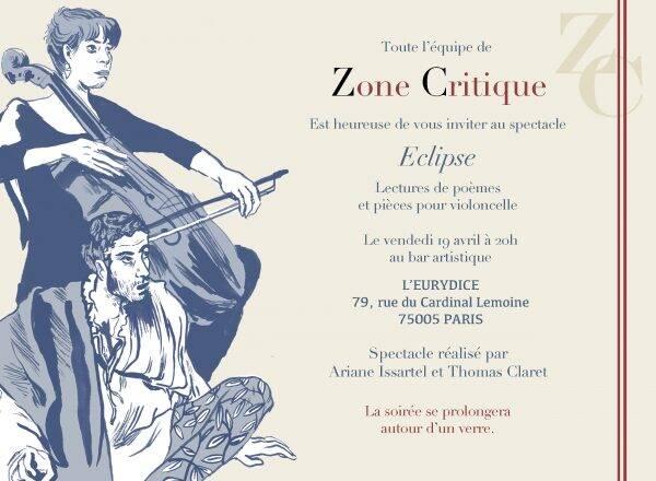 Ce vendredi, Zone Critique vous convie à sa deuxième soirée : après avoir accueilli les artistes du Tessier Quartet et le comédien Vincent Couesme en décembre, nous sommes heureux de vous présenter le spectacle de poésie et de violoncelle Eclipse. Dans le cadre raffiné et convivial du plus vieux Cabaret de Paris, le troquet artistique L’Eurydice, Zone Critique se propose d’inviter, toute l’année, des artistes d’horizons divers à venir se produire. Le spectacle est gratuit, et à destination de tous les amis de la revue, et de toute personne intéressée par l’art et la littérature. N’hésitez donc pas à venir boire un verre de cervoise ou d’absinthe, assister au spectacle, découvrir l’atmosphère unique de L’Eurydice, et rencontrer les membres de la rédaction qui seront là pour vous accueillir. À vendredi !