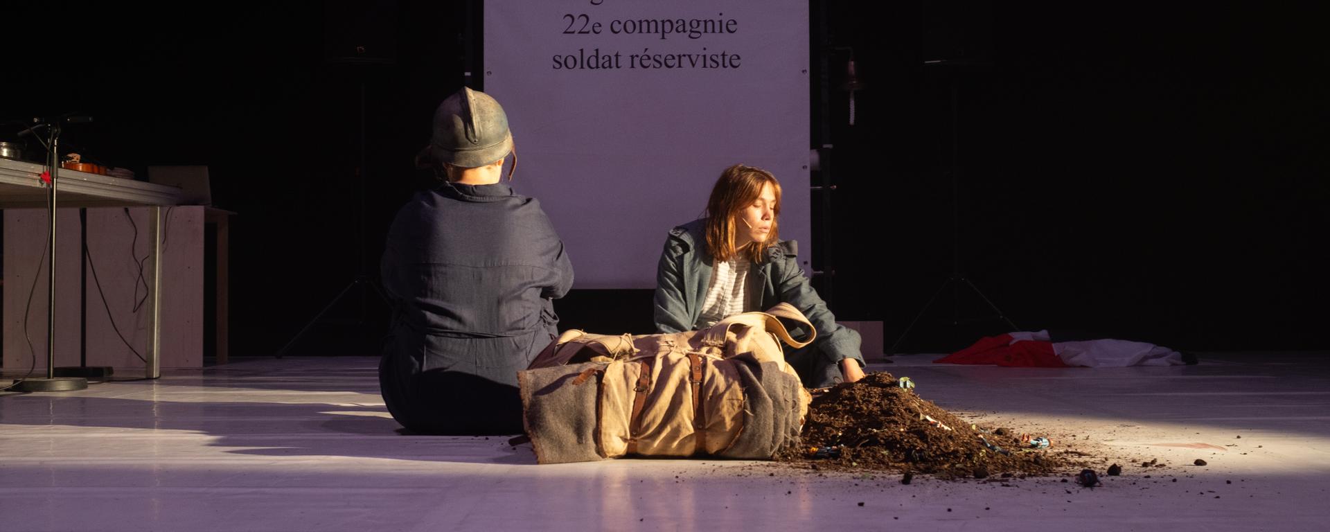 Hormis ce jeu avec le public dont les règles ont été énoncées avec malice et pédagogie, le spectateur ne tarde pas à découvrir la seconde grande originalité de ce texte dont la mise en scène est signée elle aussi par Tamara Al Saadi. Eléonore Mallo a pris place derrière d’énormes tables où se trouve savamment disposé toute son armada nécessaire pour créer les bruits et bruitages qui vont accompagner l’action et surtout en souligner le caractère extrêmement sensible et sensoriel. Eléonore Mallo gratte, frappe, entrechoque et palpe, elle frictionne, pétrit, jette et caresse. Parfois, Jennifer Montesantos ou Tamara Al Saadi lancent une machine à fumée dont les nuages restent longtemps suspendus dans l’air, comme si les ombres blanches et pures des jeunes âmes sacrifiées pour la patrie venaient, avec le public, prolonger encore un peu leur vie sur terre. À d’autres moments, elles déplacent des projecteurs et créent des jeux d’ombres qui précipitent la salle dans une ambiance crépusculaire et sépulcrale. De la clameur des rues parisiennes où les marchands ambulants vendent à tue-tête leur bric-à-brac et les maraîchers leurs fruits et légumes à l’ordre de mobilisation claironné par les vendeurs de journaux, en passant par un Ave Maria susurré sur les cadavres encore chauds des compagnons tombés sous les balles ennemies, la guerre apparaît comme une déflagration inattendue, sournoise et imprévisible.