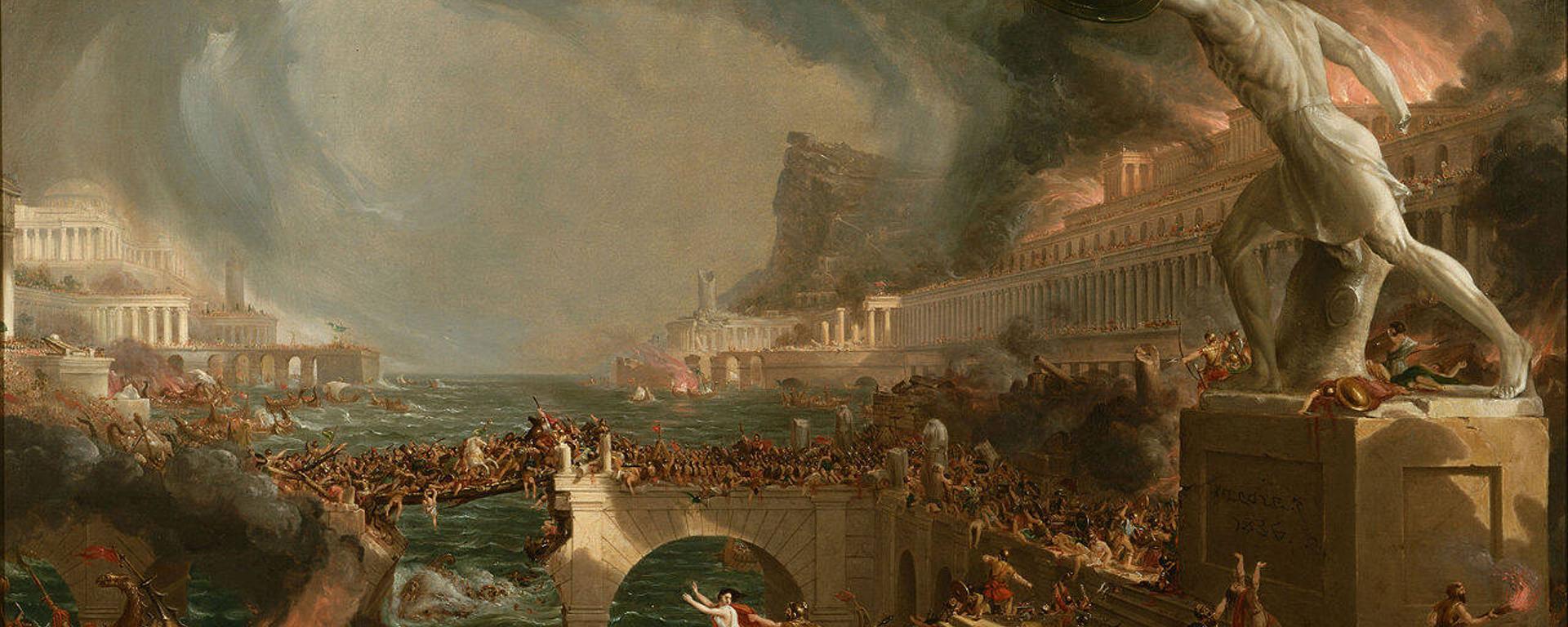 Des thèmes qui occasionnent des rapprochements démentiels. On peut ainsi observer, sous l’autorité du même texte intitulé « Paradis naturels et artificiels », une oeuvre de Jeff Koons (Gazing Ball (gilded bikini), 2012-2015) mise à côté d’une fresque en cinq tableaux de Thomas Cole, peintre américain du XIXème siècle, représentant la chute des cultures antiques. Thomas Cole défend une vision cyclique de l’histoire avec ces cinq toiles intitulées L’État sauvage, L’État arcadien, L’Apogée, La Destruction, La Désolation. Etait-ce suffisant pour rapprocher cette peinture influencée par le romantisme et le naturalisme d’une reproduction de sculpture antique portant un bikini doré et se penchant, il est vrai ,vers une balle bleue en aluminium- symbole évident de circularité? A trop vouloir montrer que l’histoire a un sens, qu’elle ne fait que se répéter, toute la scénographie apparaît franchement insensée- voire hallucinée (comme ces premières villes étrusques qui renverraient à une toile de Fernand Léger représentant des ouvriers dans la France de 1951…).