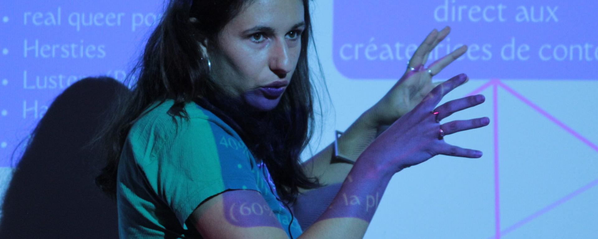 Dans mon travail, il n’y a pas de parodie ou de cynisme. Je joue avec les codes. Quand je fais la performance Ce qu’il vous manque pour monter votre boîte de production X, j’arrive comme une coach business, en essayant de transmettre véritablement tout ce que j’ai appris dans la pornographie. Seulement, au fur et à mesure de la performance, les gens comprennent que ce qu’il leur manque, c’est de résoudre le conflit des Sex Wars (conflit qui oppose les pro-sexe et les abolitionnistes) et qu’il faut se syndiquer, faire la révolution et changer le monde ! C’est pousser le raisonnement jusqu’au bout.